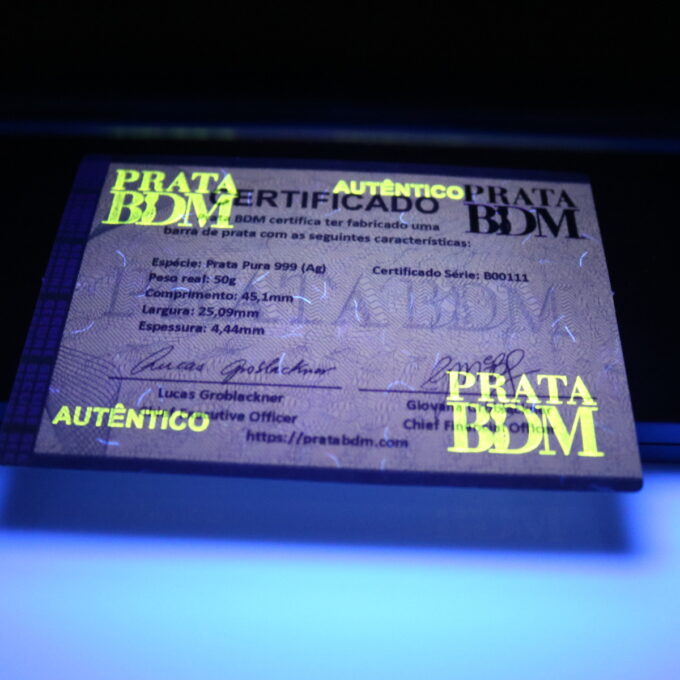 Papel de certificado com filamentos luminosos, microimpressões, elementos visíveis por luz ultravioleta, elementos em hot stamping e faixa holográfica. Todas essas características e elementos de segurança do certificado torna absolutamente complexo a sua falsificação. Dando assim confiabilidade ao proprietário da barra, assim como, facilitando uma revenda futura.
